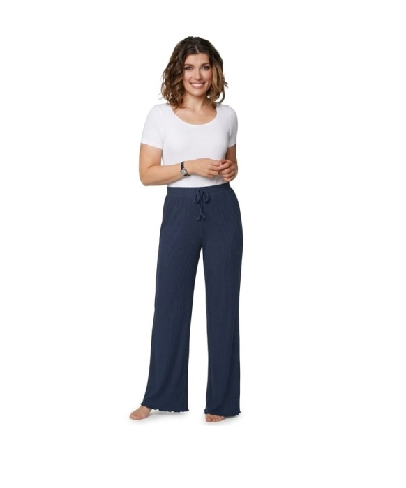 Redefinește serile de relaxare cu acești pantaloni de pijama pentru damă, creați special pentru femeia care nu vrea să sacrifice stilul nici măcar în timpul somnului. Având o croială modernă evazată (flare) și o nuanță versatilă de albastru, acești pantaloni oferă un look chic și o libertate de mișcare deplină.